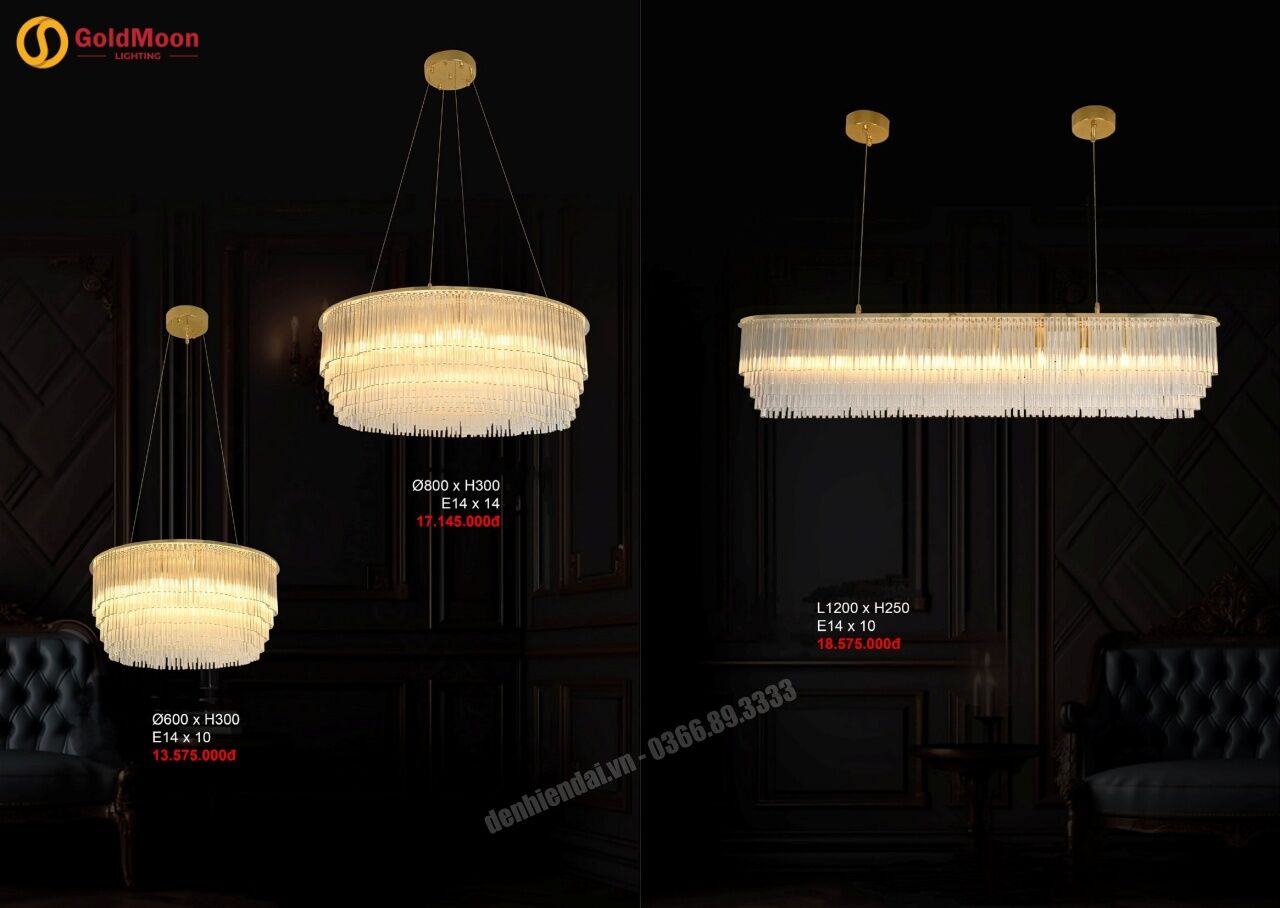 - GMT1100T T800: Kích thước 800*300, 14 bóng E14, phù hợp với phòng khách vừa và lớn, phòng ăn hoặc không gian sinh hoạt chung.